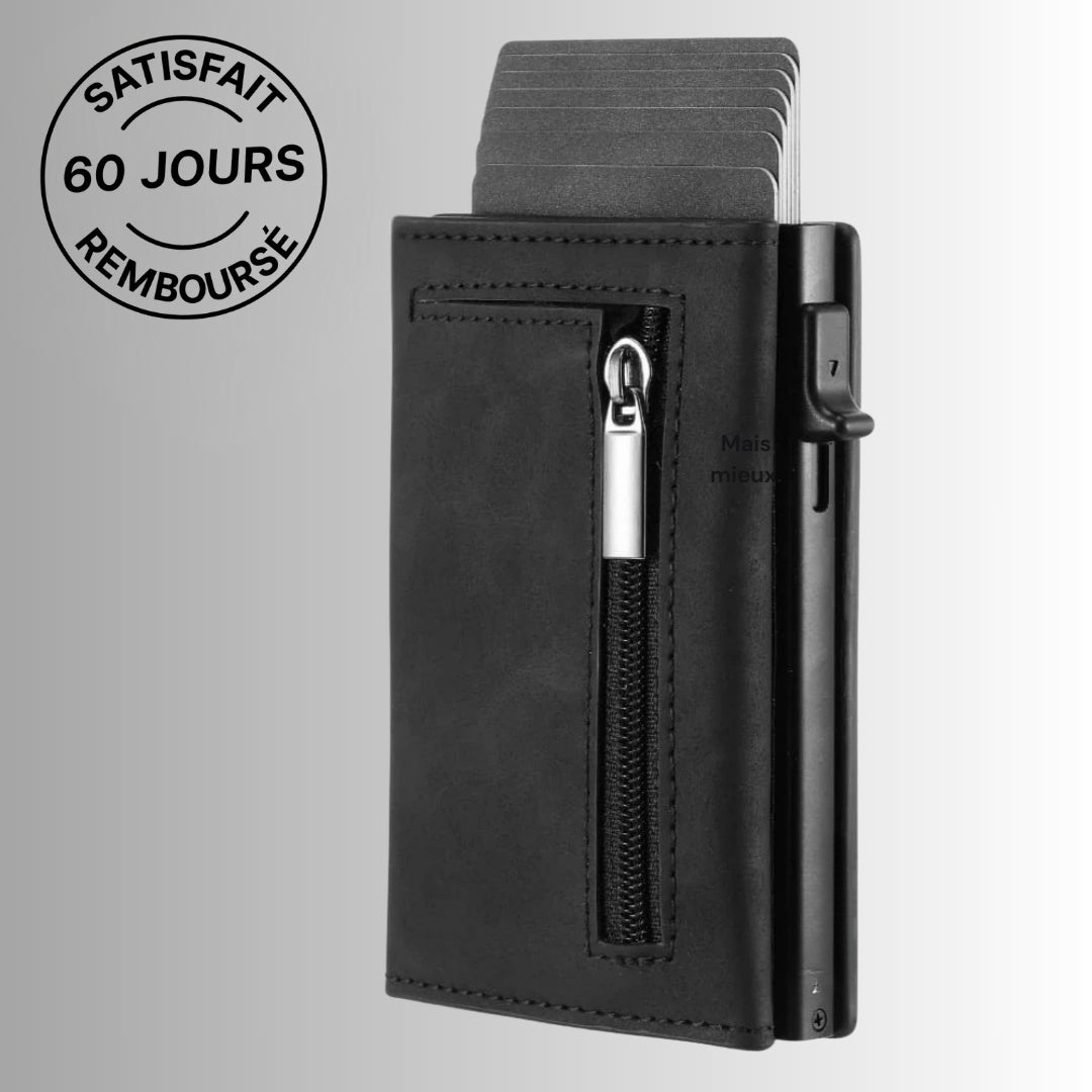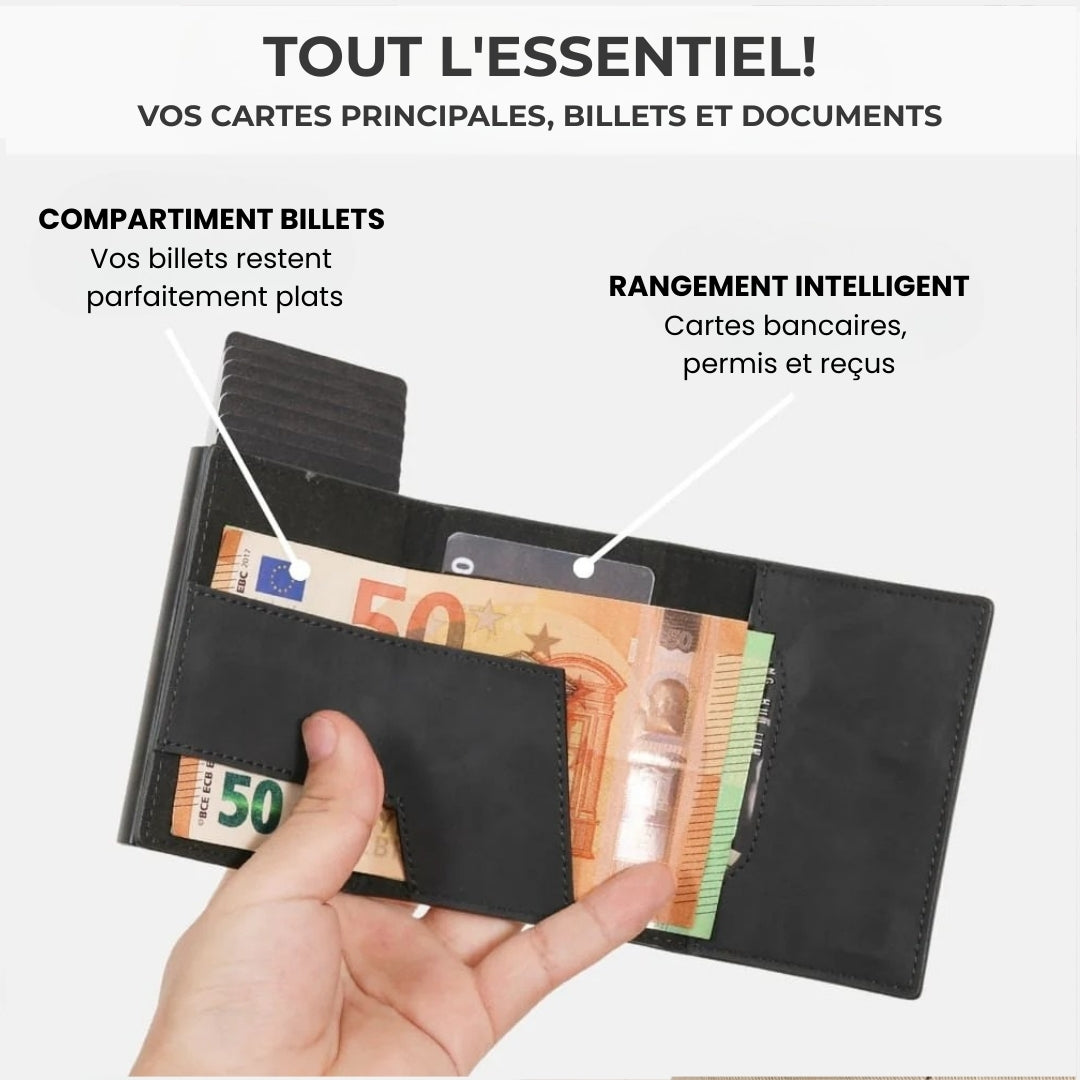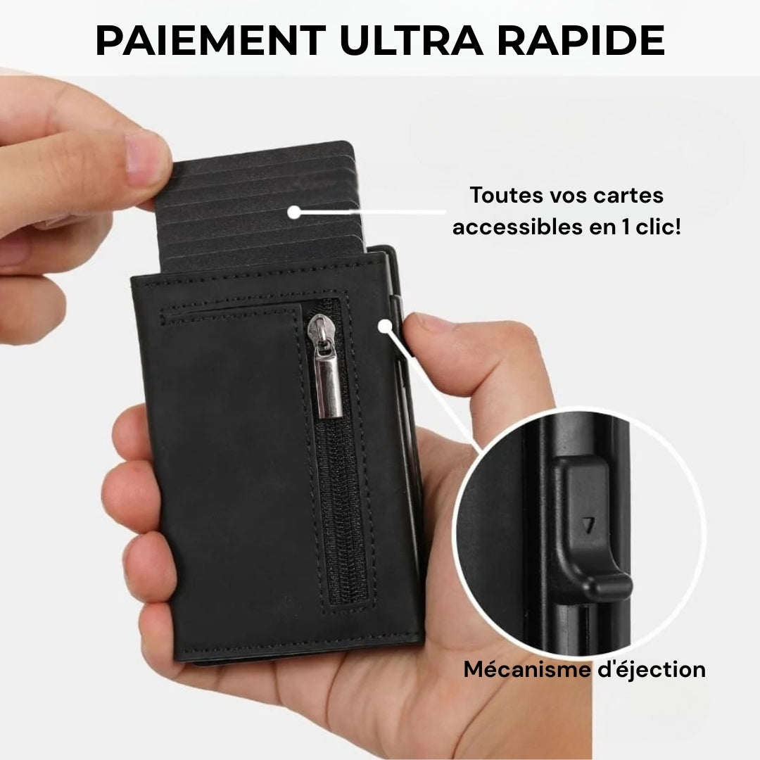 Grâce à notre système d’éjection intelligent, accédez à toutes vos cartes en un seul clic. De plus, le porte cartes bloque les signaux RFID et NFC, protégeant vos données contre le vol électronique.