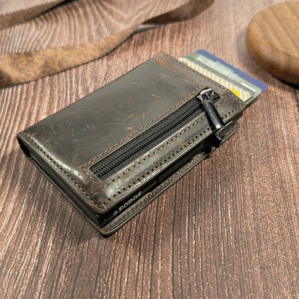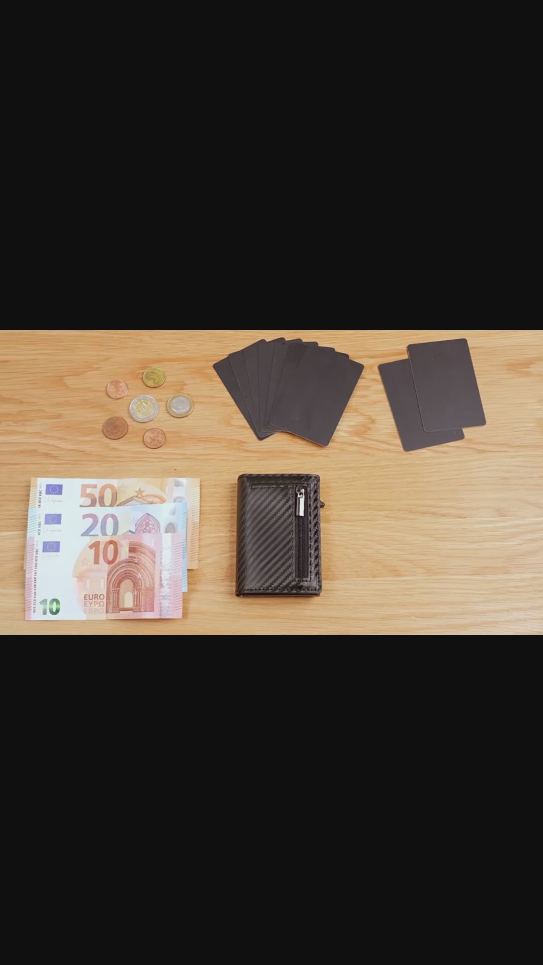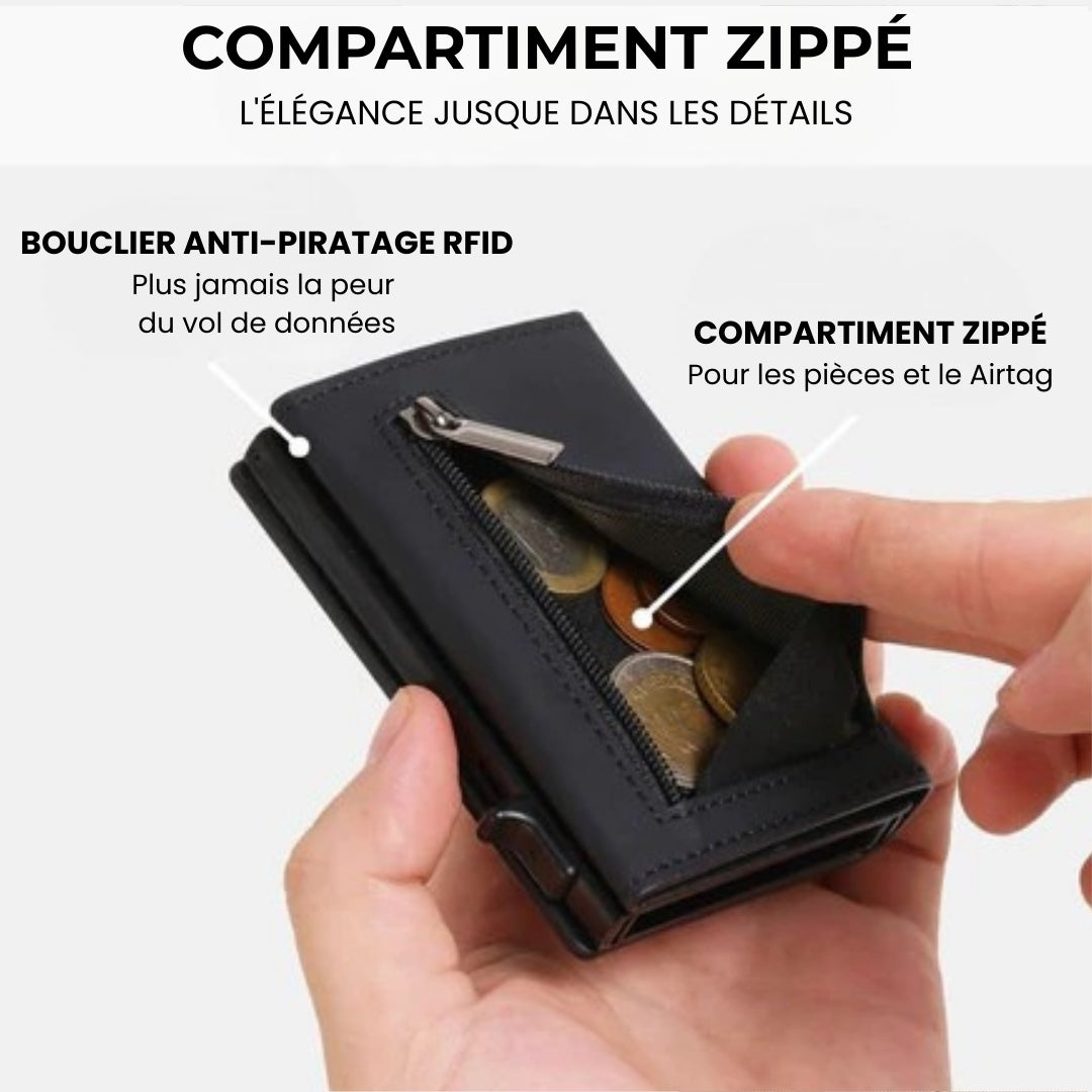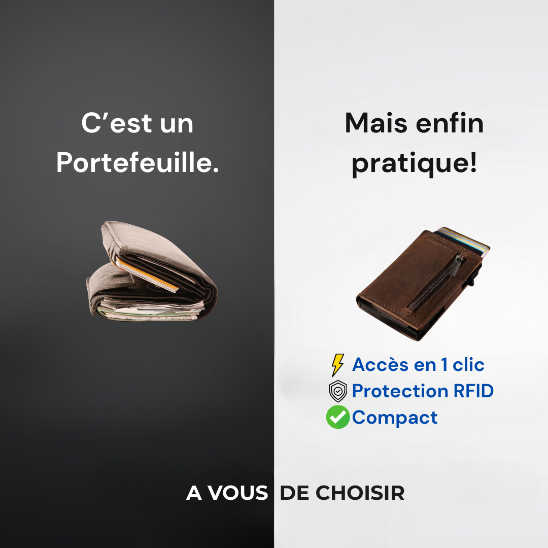 Grâce à notre système d’éjection intelligent, accédez à toutes vos cartes en un seul clic. De plus, le porte cartes bloque les signaux RFID et NFC, protégeant vos données contre le vol électronique.